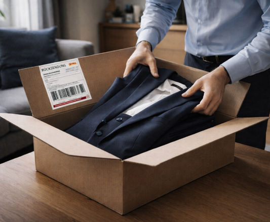 Bitte nutzen Sie das mitgelieferte Rücksendeetikett, um den Anzug innerhalb von 7 Tagen nach Erhalt zurückzusenden.
