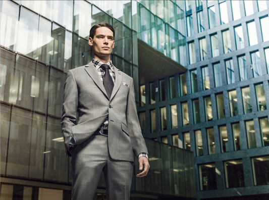 Grau karierter Anzug aus Finewool 130s Klassischer grauer Anzug aus Finewool 130s mit Karomuster für einen stilvollen, professionellen Auftritt.