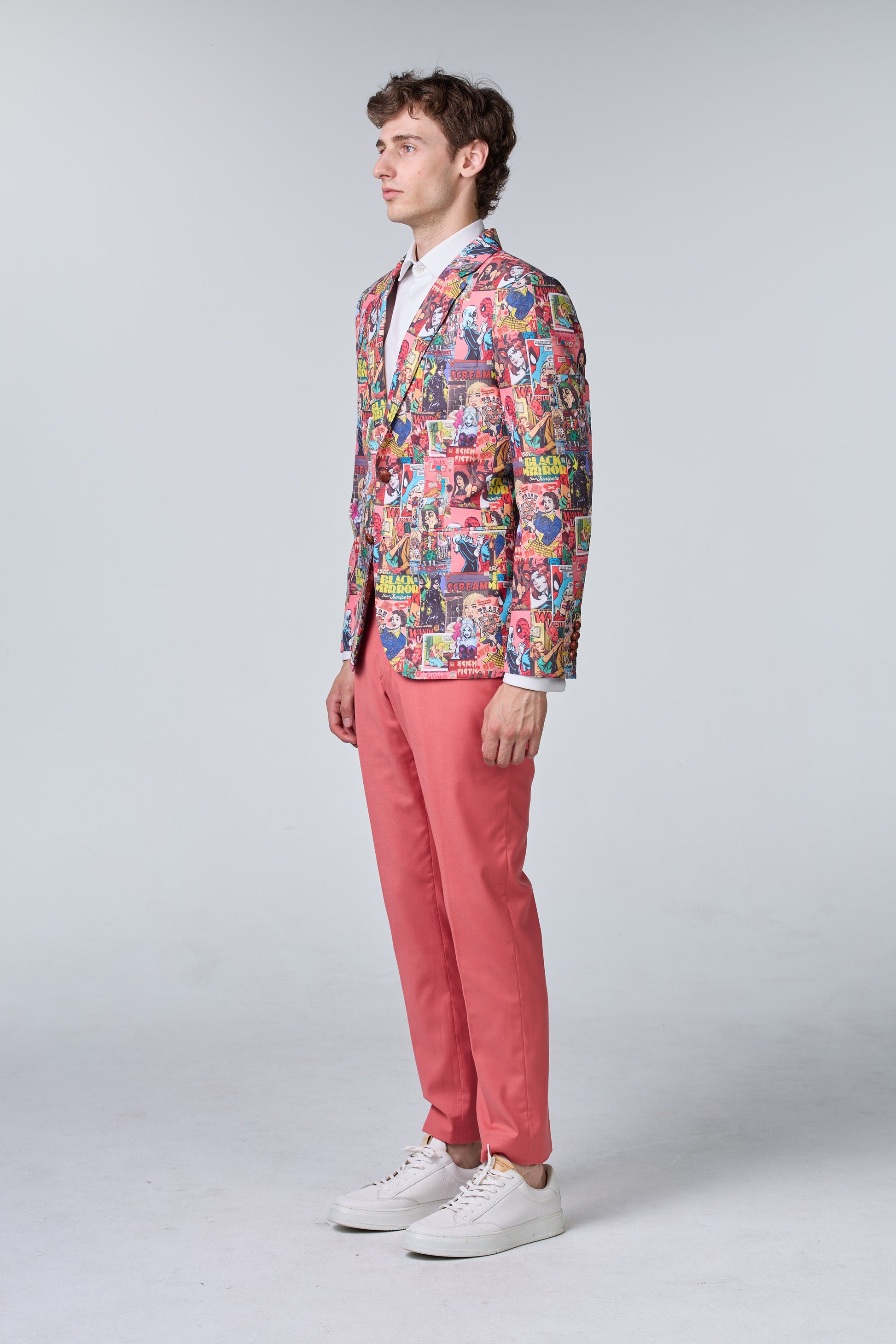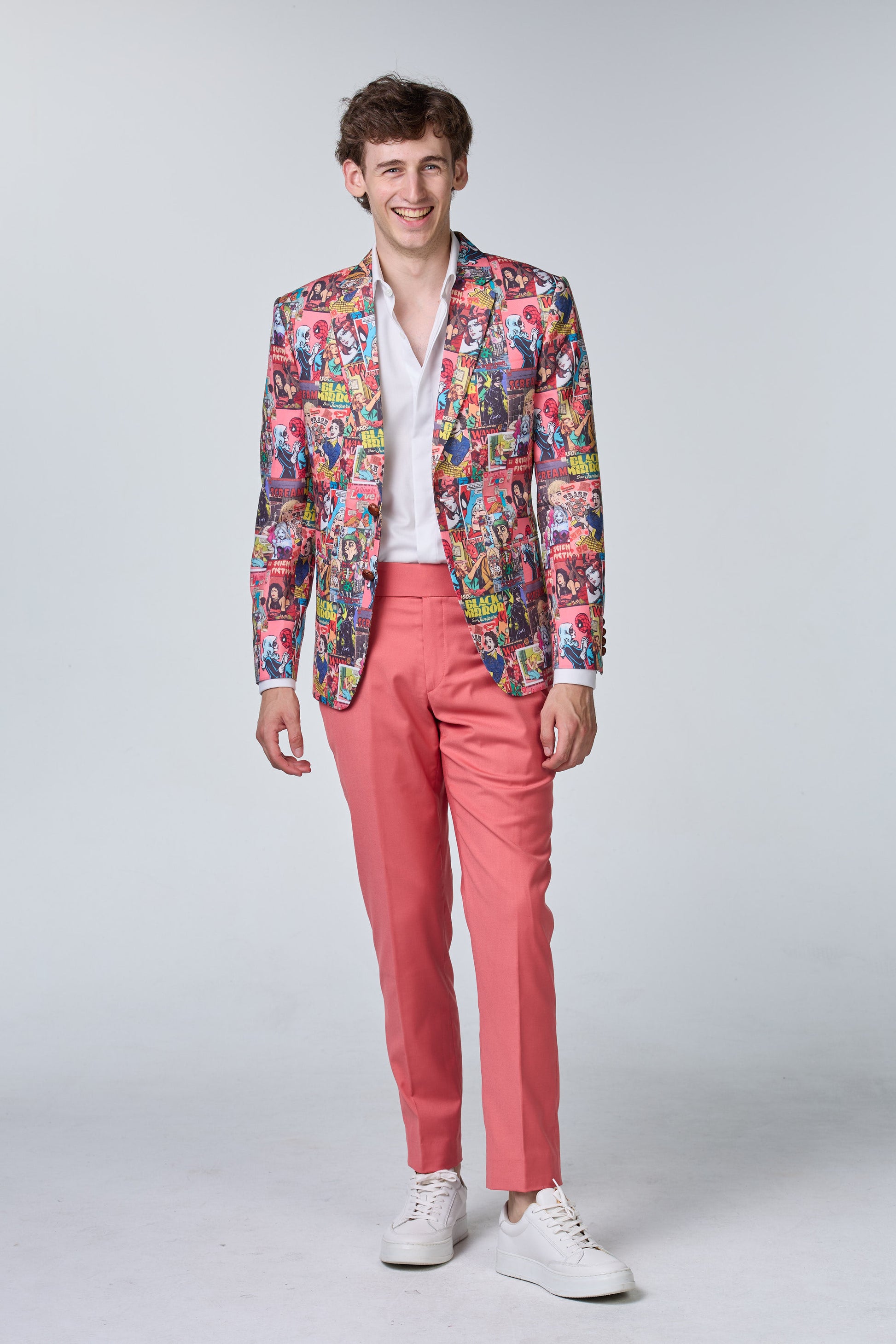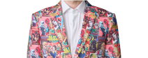 Anzug mit Comic-Muster Auffälliger Anzug mit verspieltem Comic-Muster für einen außergewöhnlichen und kreativen Auftritt.