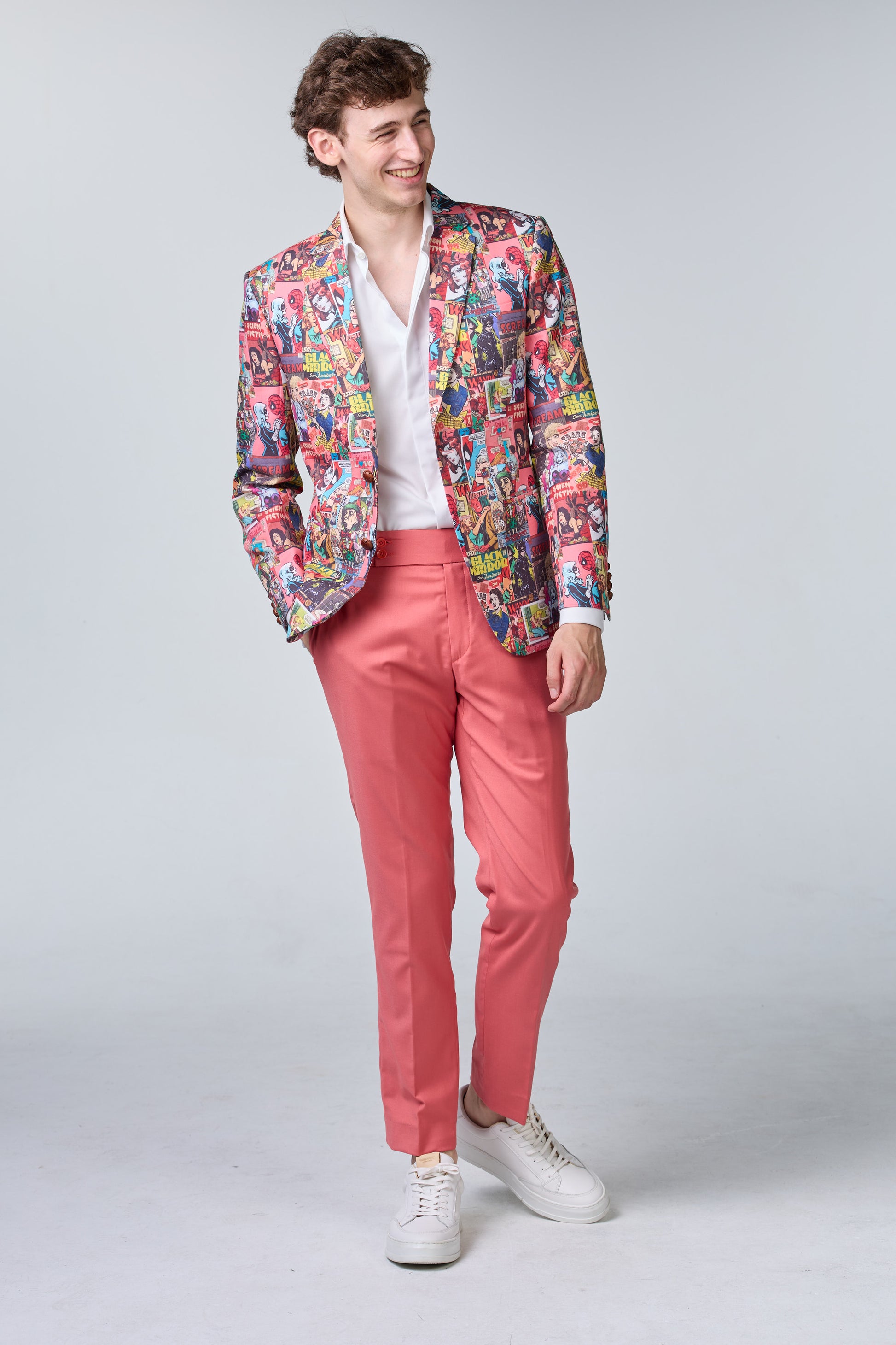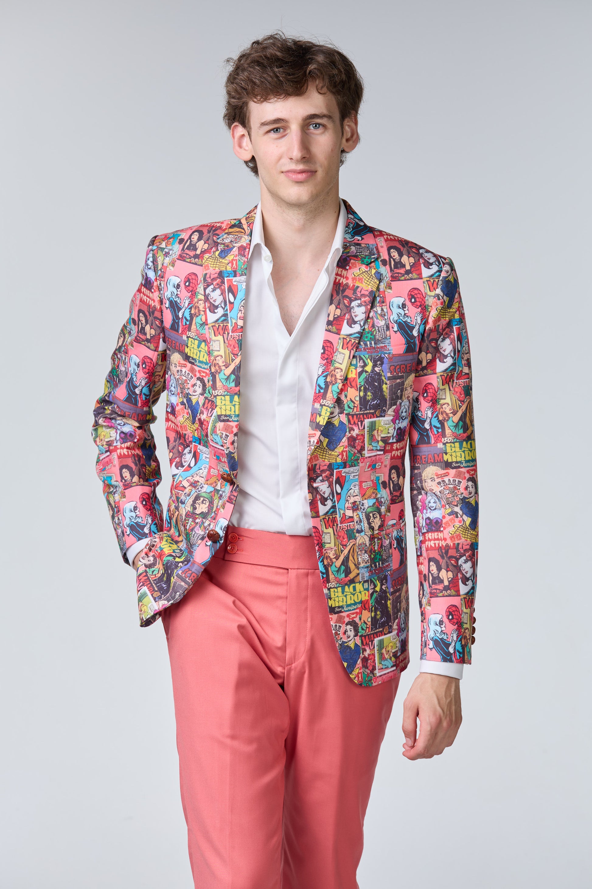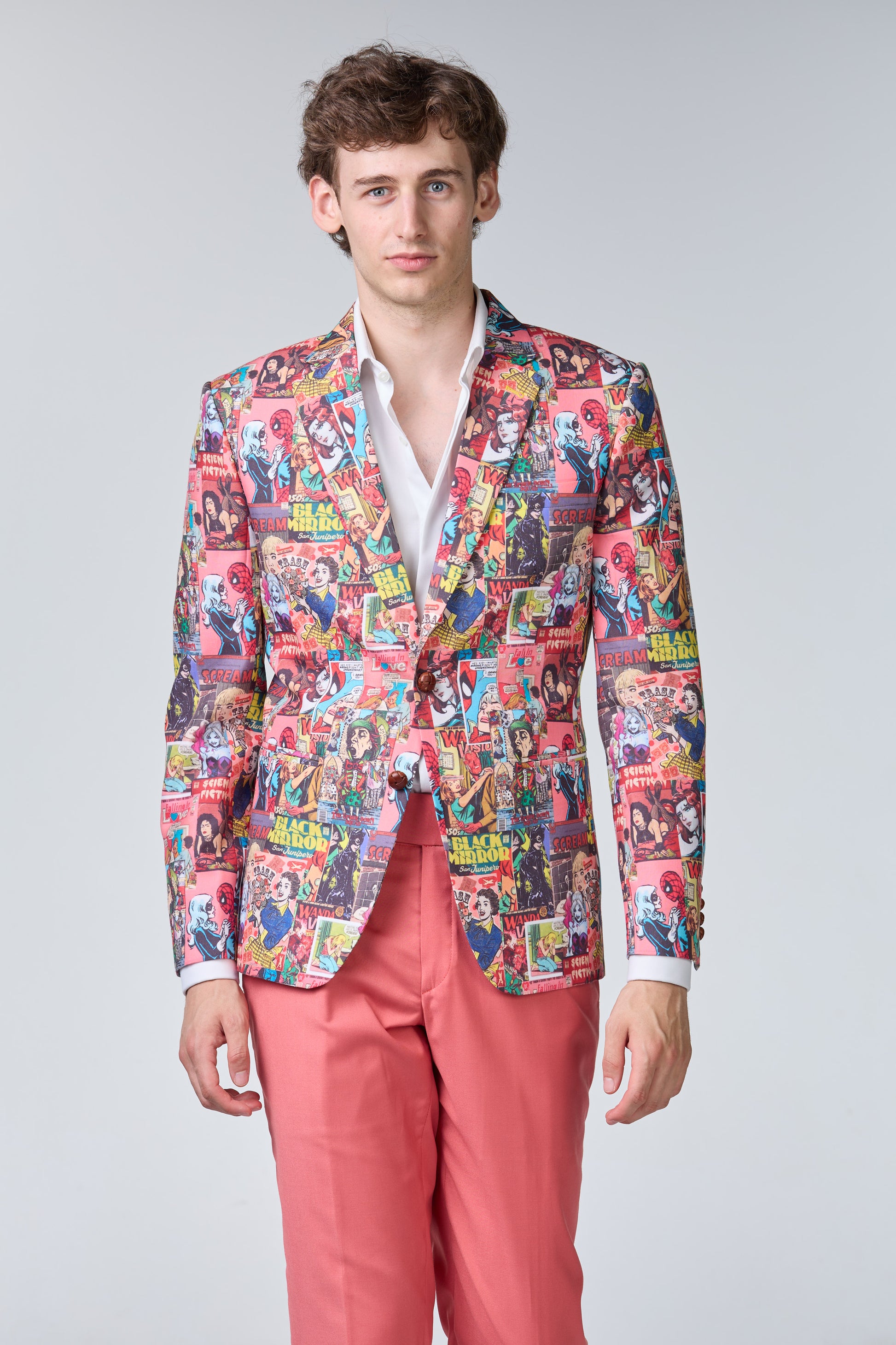 Anzug mit Comic-Muster Auffälliger Anzug mit verspieltem Comic-Muster für einen außergewöhnlichen und kreativen Auftritt.