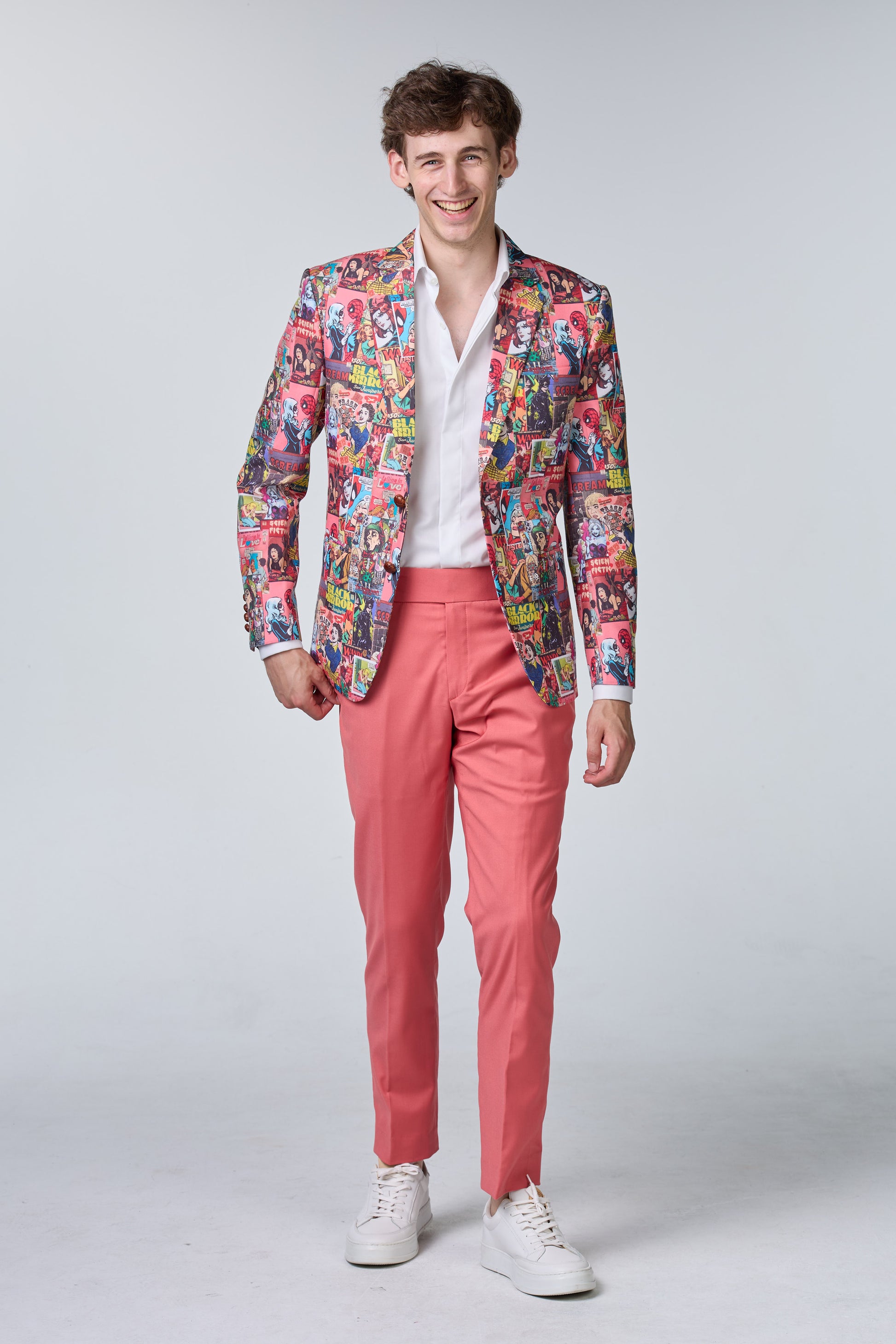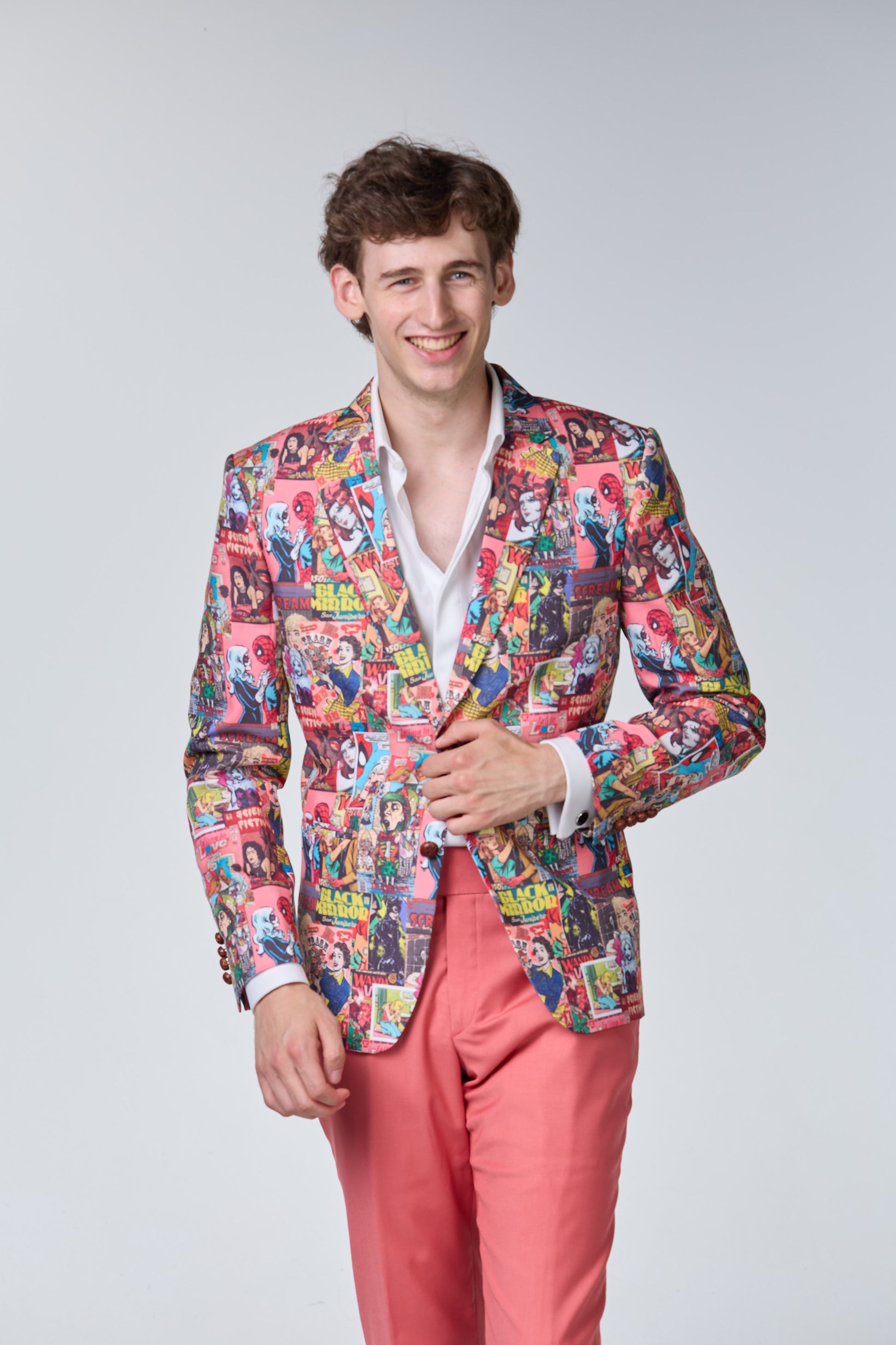 Anzug mit Comic-Muster Auffälliger Anzug mit verspieltem Comic-Muster für einen außergewöhnlichen und kreativen Auftritt.
