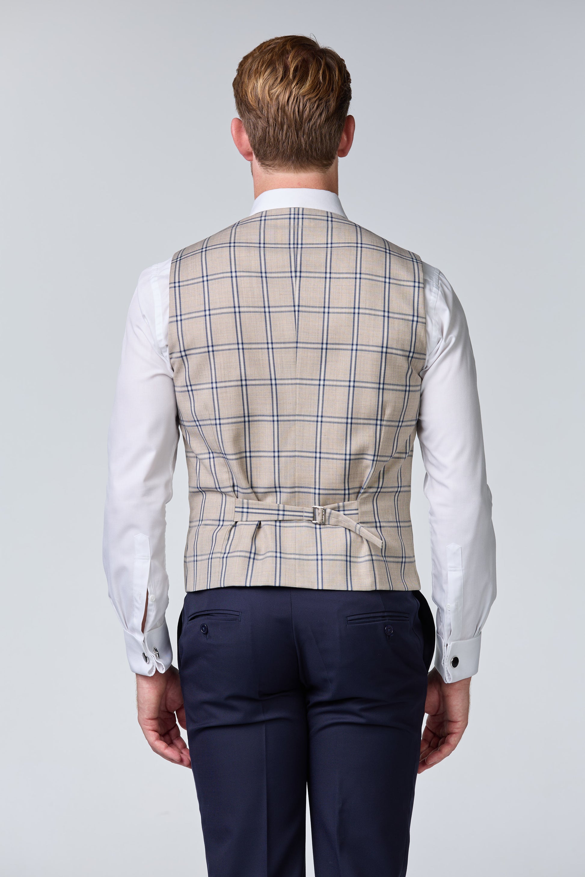 Dreiteiliger Hochzeitsanzug Blau mit Beige Weste Dreiteiliger Hochzeitsanzug in Blau mit einer kontrastierenden beigen Weste für einen eleganten Look.