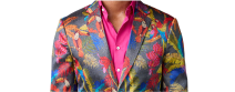 Seidensakko mit Muster und königsblauer Hose Ein Seidensakko mit einzigartigem Muster, kombiniert mit einer königsblauen Hose für einen extravaganten Stil.