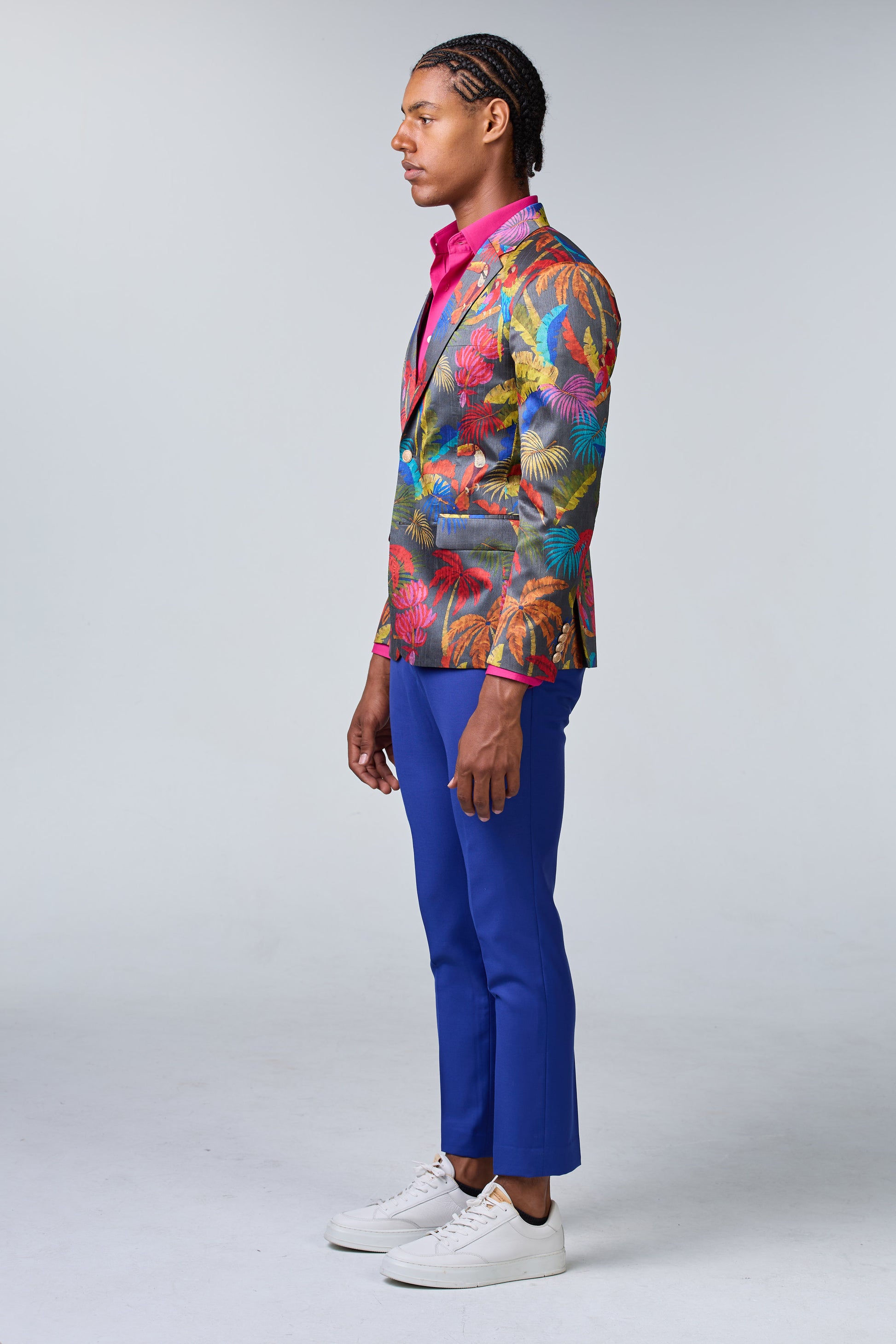 Seidensakko mit Muster und königsblauer Hose Ein Seidensakko mit einzigartigem Muster, kombiniert mit einer königsblauen Hose für einen extravaganten Stil.